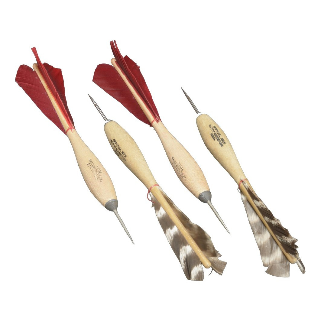Wooden handle darts with red or brown/white striped feathers and metal tips.