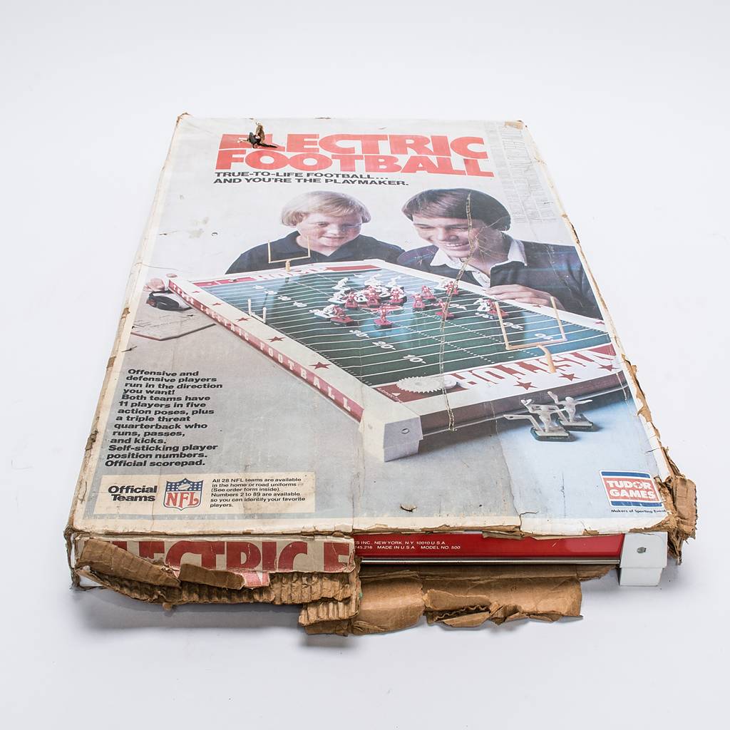 The game is played on a metal field, plastic players on bases, which react to the vibration of the field, are placed on the field in formati...