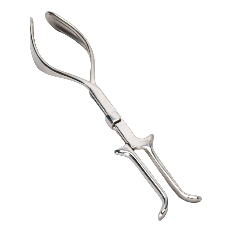 Obstetrical forceps with a smooth handle and solid blades. Comes in two separate pieces that do not lock together.
