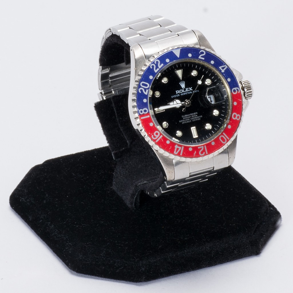 Silver oyster-style band and case, "Pepsi" red/blue bezel, black dial and white/silver markers and hands.