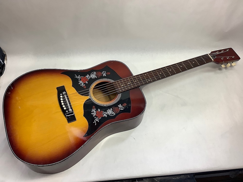 It has a Sunburst style finish and an etched Rose Pickguard. The two bl...