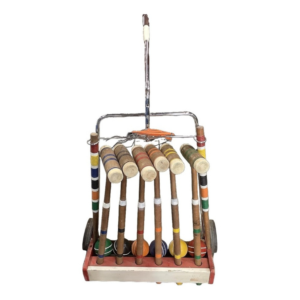 Vintage FORSTER Wooden 6 Player Croquet Set Wheeled Cart/Wickets/Balls/Mallets