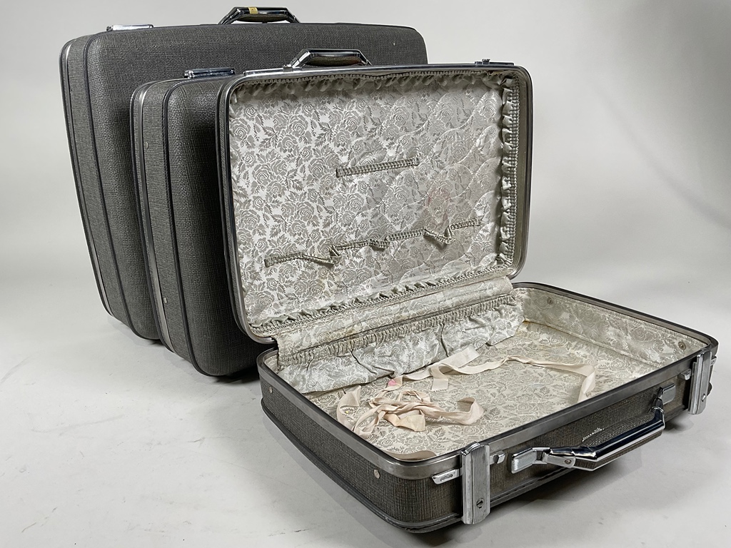 3 piece set of vintage grey American Tourister nesting suitcases.